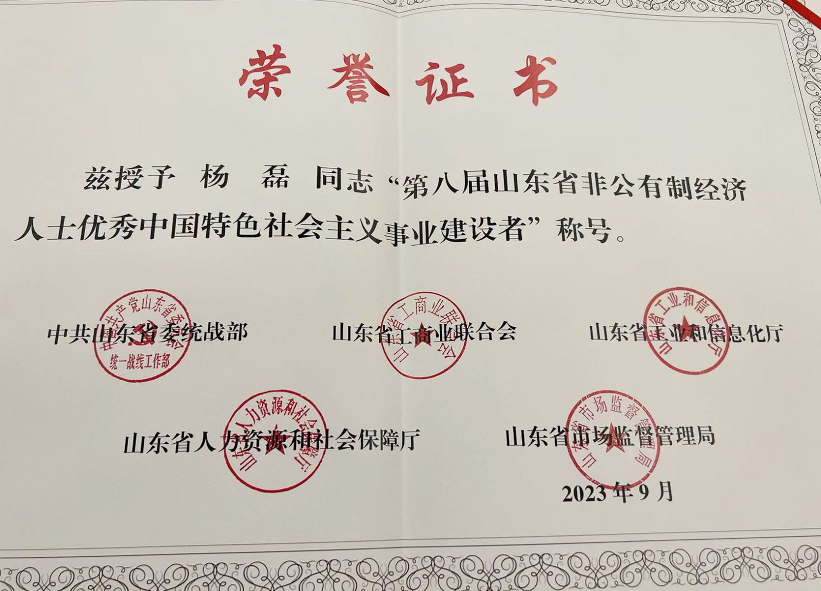 9月14日上午,第八届山东省非公有制经济人士优秀中国特色社会主义事业建设者表彰大会在济南召开。会上,富康集团党委书记、总裁杨磊被授予“山东省非公有制经济人士优秀中国特色社会主义事业建设者”荣誉称号。