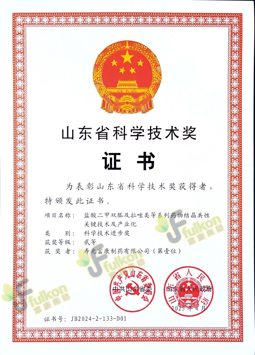 近日,中共山东省委、山东省人民政府颁发山东省科学技术奖证书,富康集团凭借“盐酸二甲双胍及拉唑类等系列药物结晶共性关键技术及产业化”项目荣获2024年度省科学技术进步二等奖。