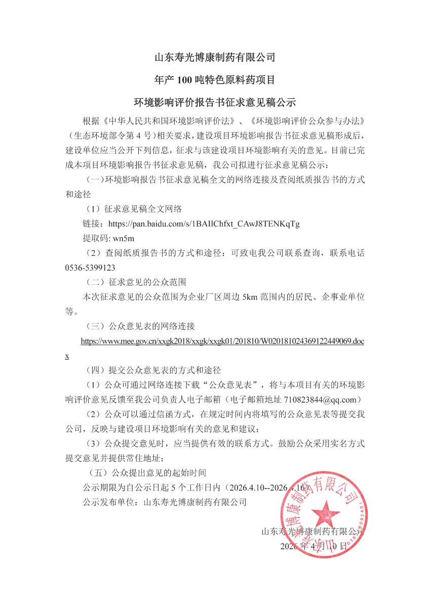 山东寿光博康制药有限公司年产100吨特色原料药项目环境影响评价报告书征求意见稿公示