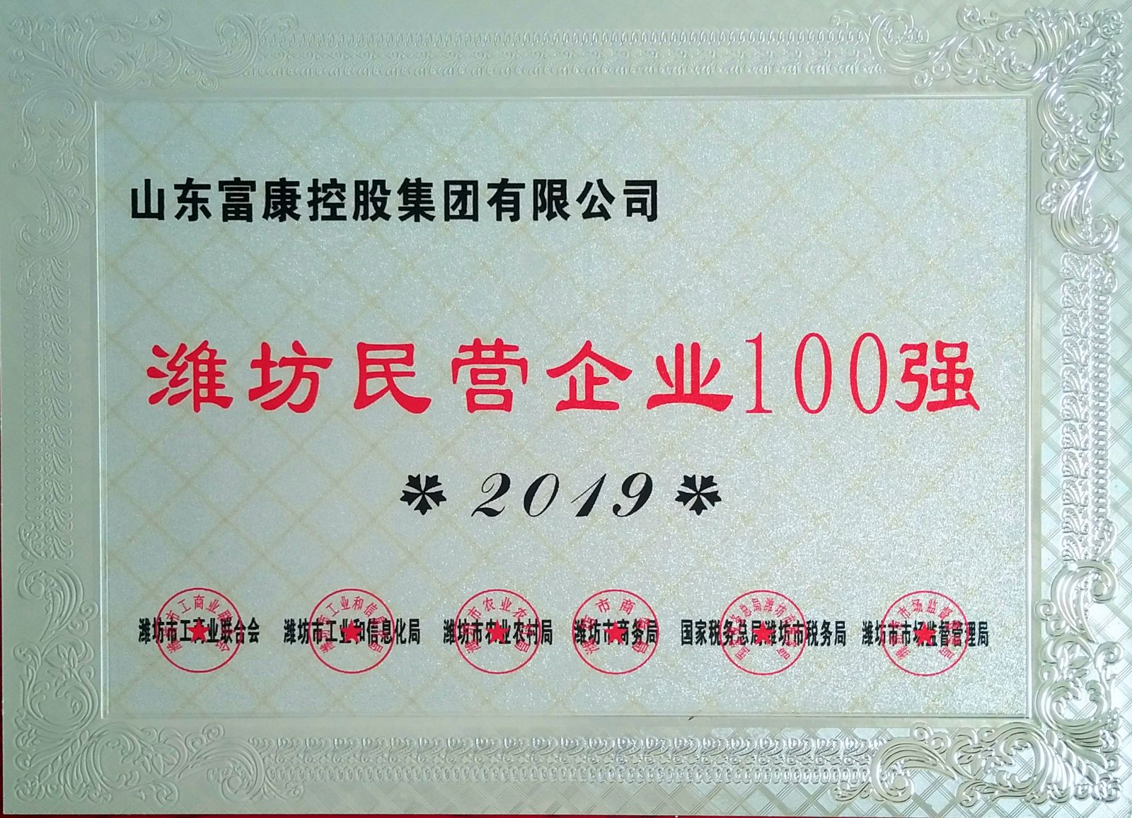 7月25日上午,2019年潍坊民营企业100强发布会成功召开。会议揭晓了2019年“潍坊民营企业100强”榜单,并进行现场授牌。富康集团荣获“潍坊民营企业100强”称号,列榜单第28位。